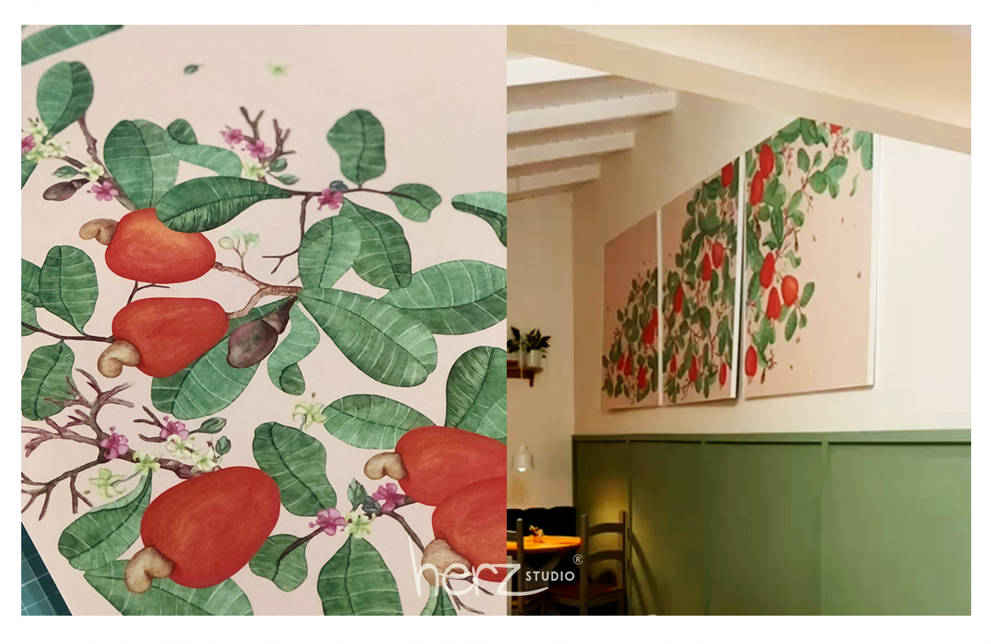 Arte produzida em papel de parede e emoldurada.