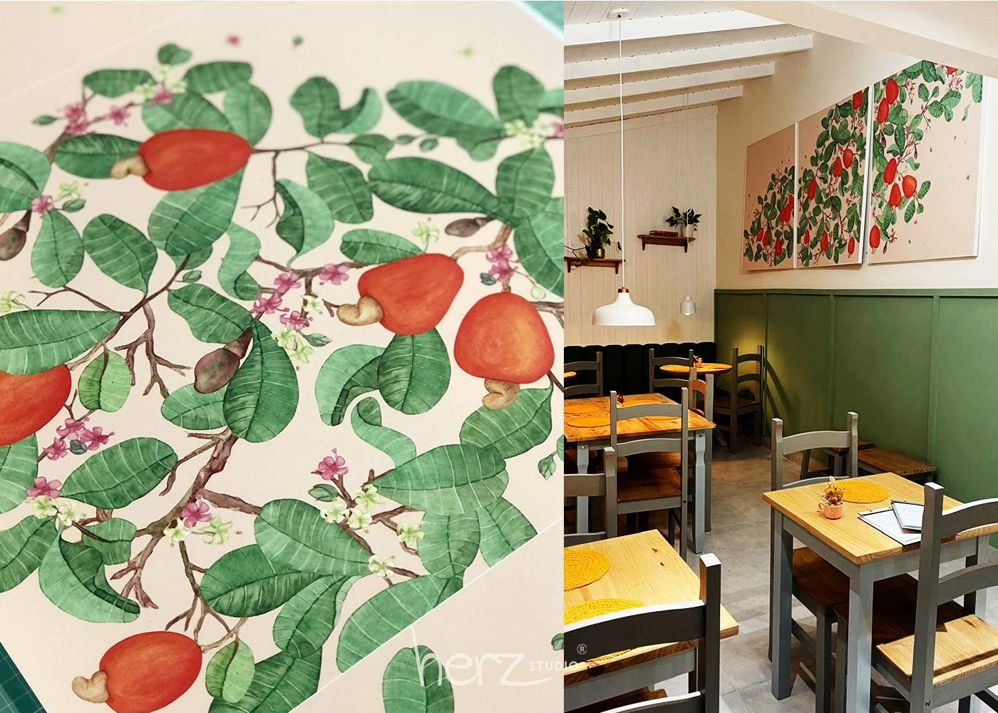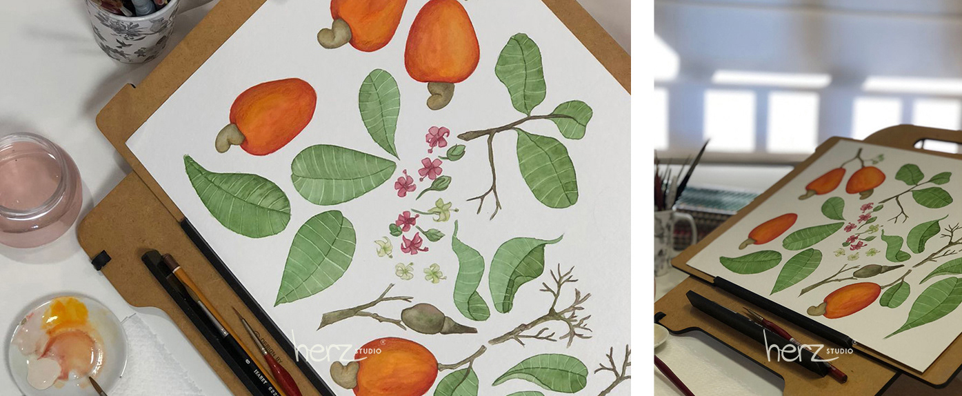 A técnica escolhida foi aquarela em cores vibrantes e finalização em lápis de cor. Cada elemento foi ilustrado individualmente.