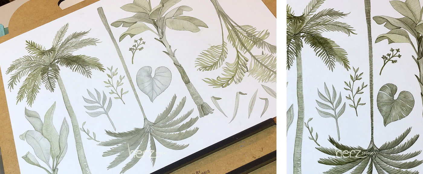 Técnica grafite e aquarela em tons esverdeados. Cada elemento foi ilustrado individualmente.