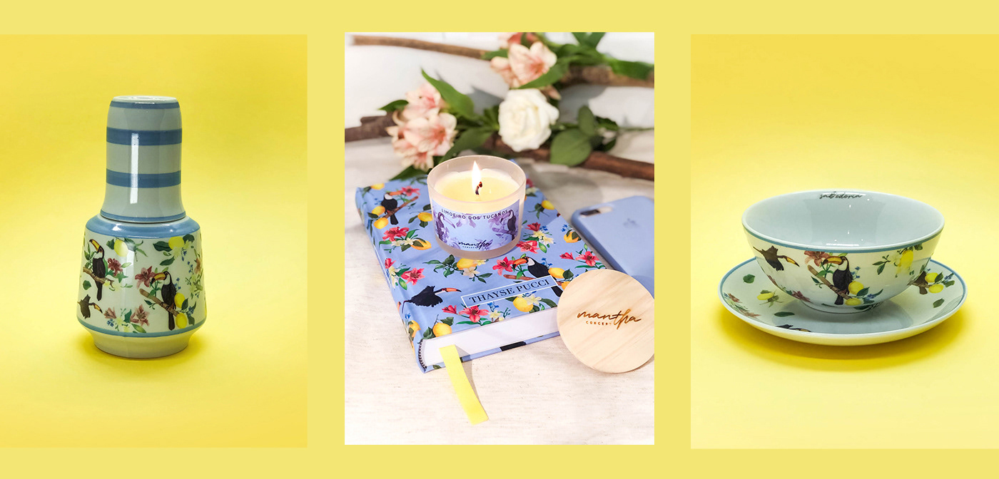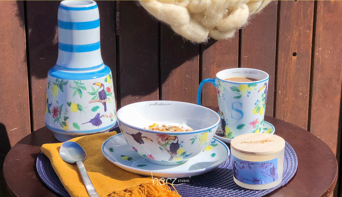 Estampa exclusiva criada em aquarela para aplicação em produtos de papelaria e porcelanas.