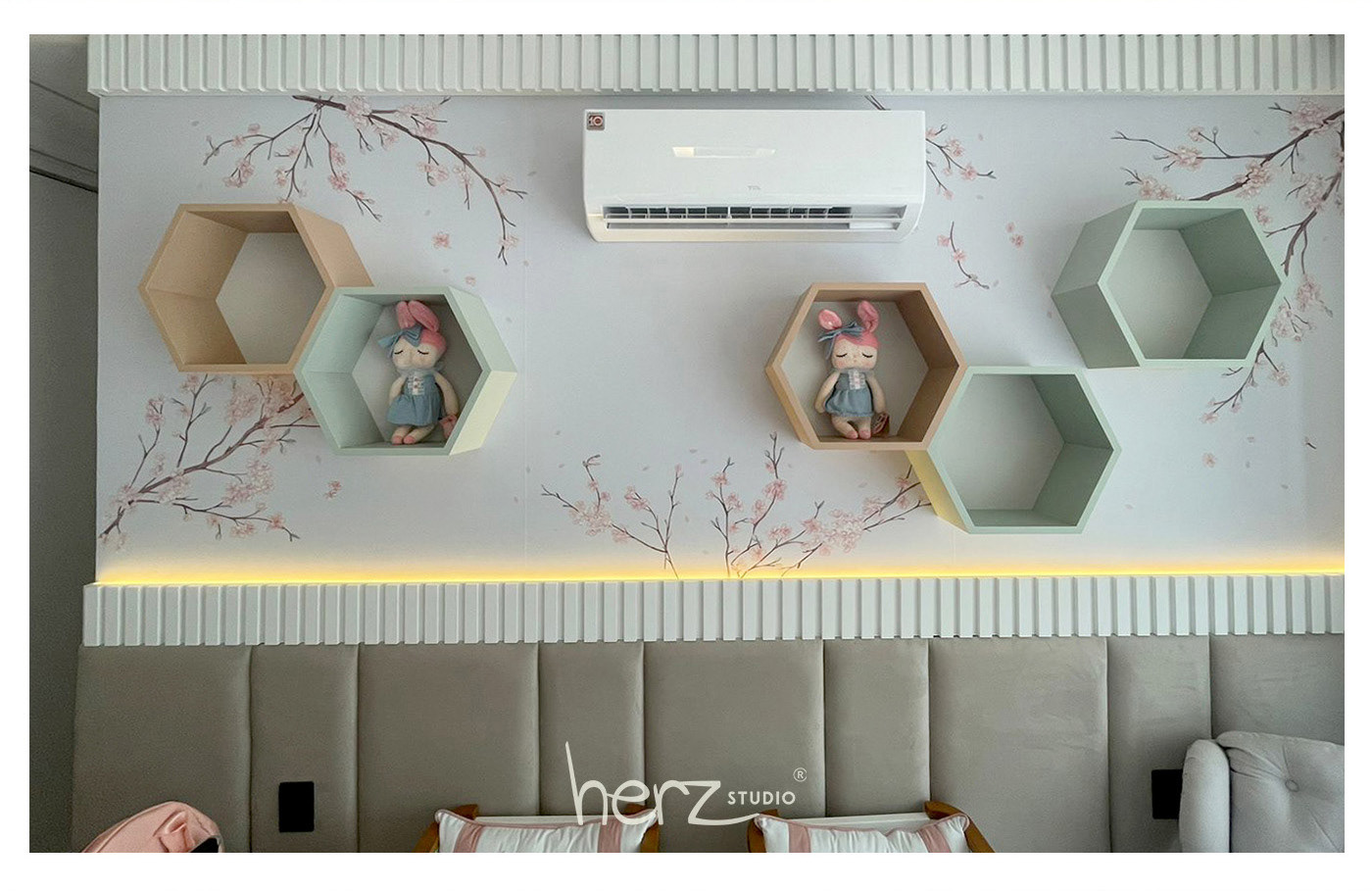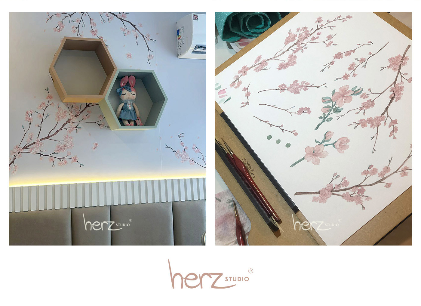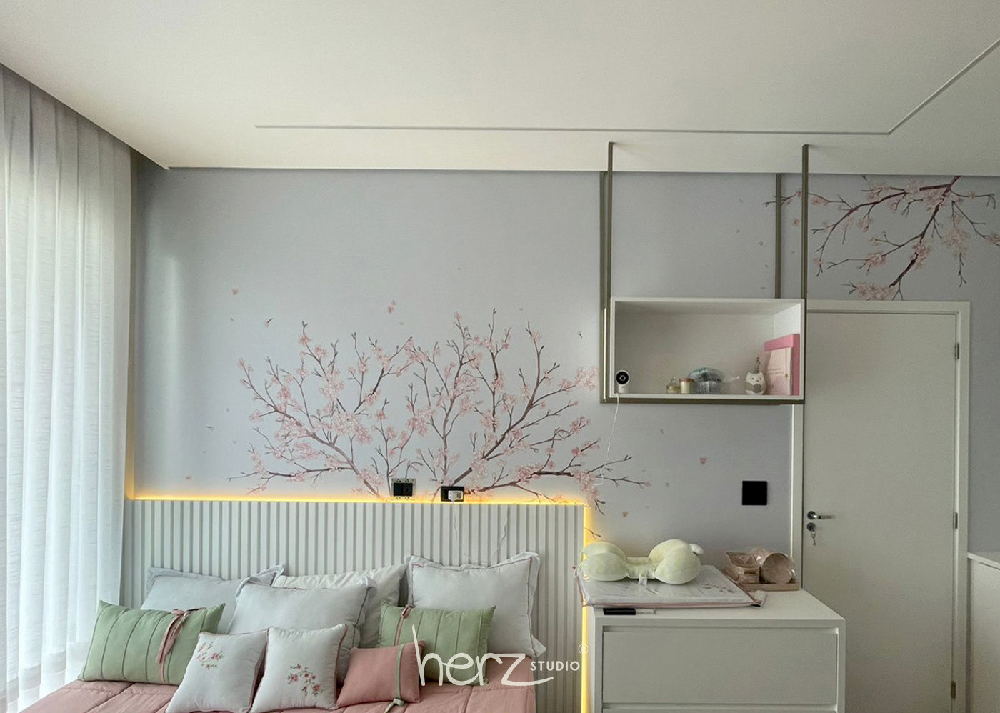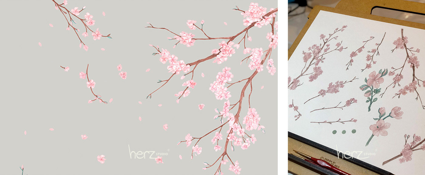 As cerejeiras foram o tema escolhido para o quarto de gêmeas descendentes de japoneses. Com delicadeza ilustramos flores em tons rose e galhos, criando posteriormente a arte para cada parede. O resultado foi um ambiente tranquilo e leve, pronto para a chegadas das bebês.