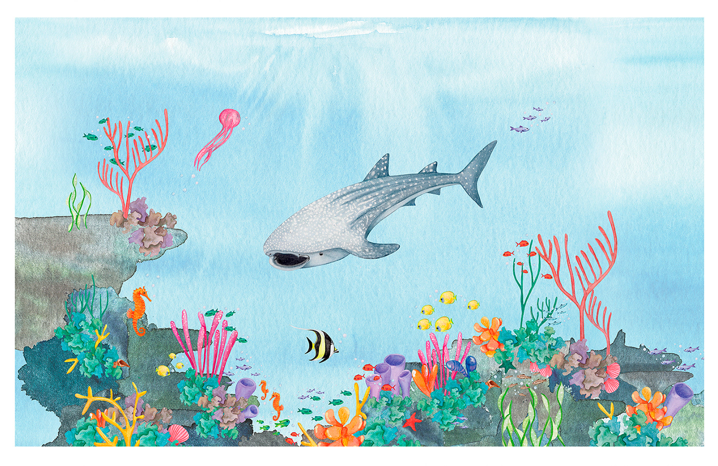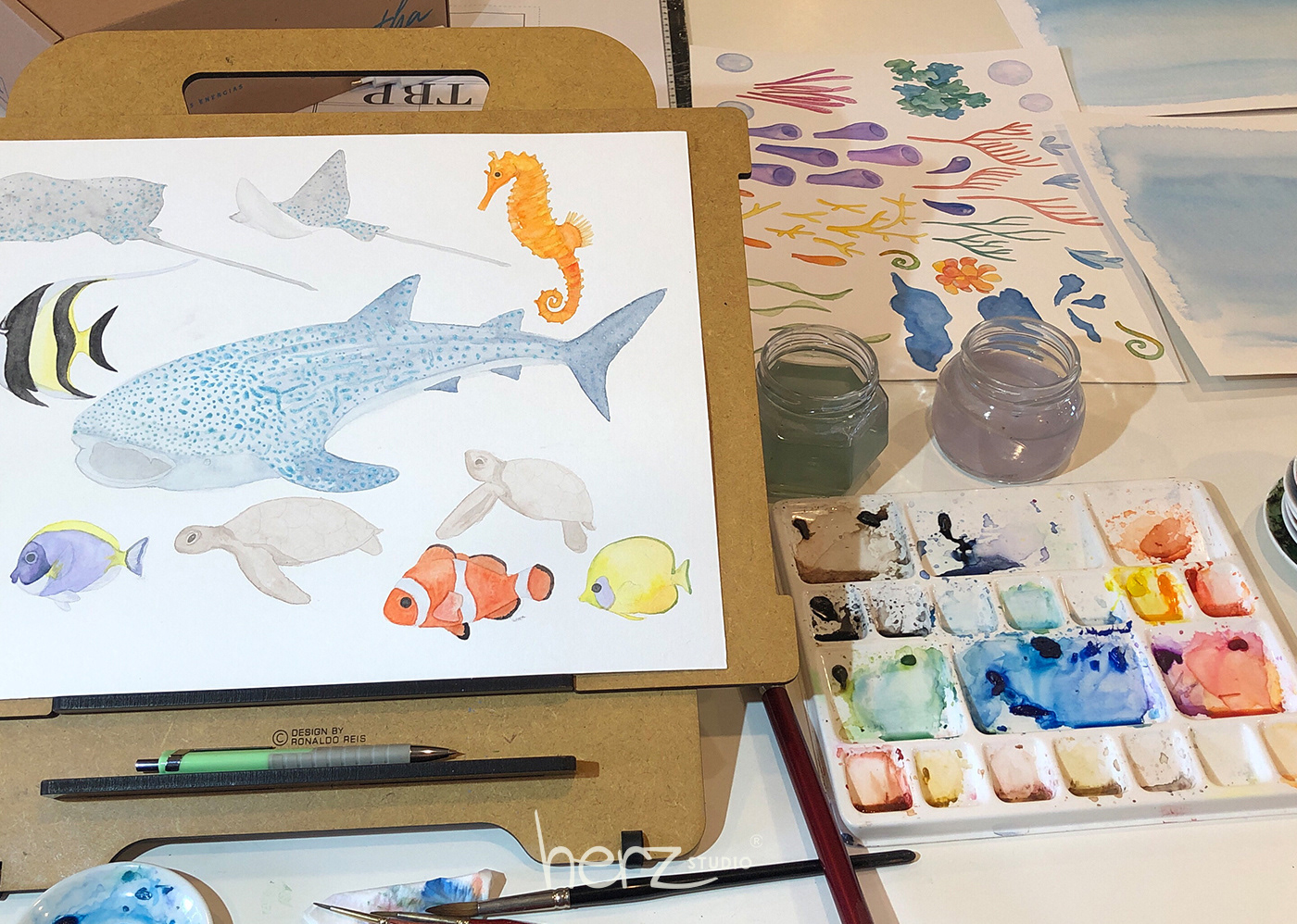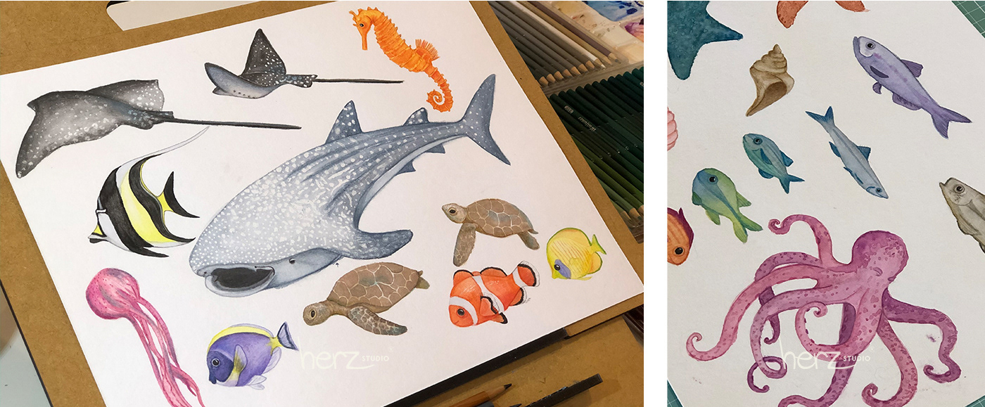 A técnica escolhida foi aquarela e finalização em lápis de cor. Cada elemento foi ilustrado individualmente.