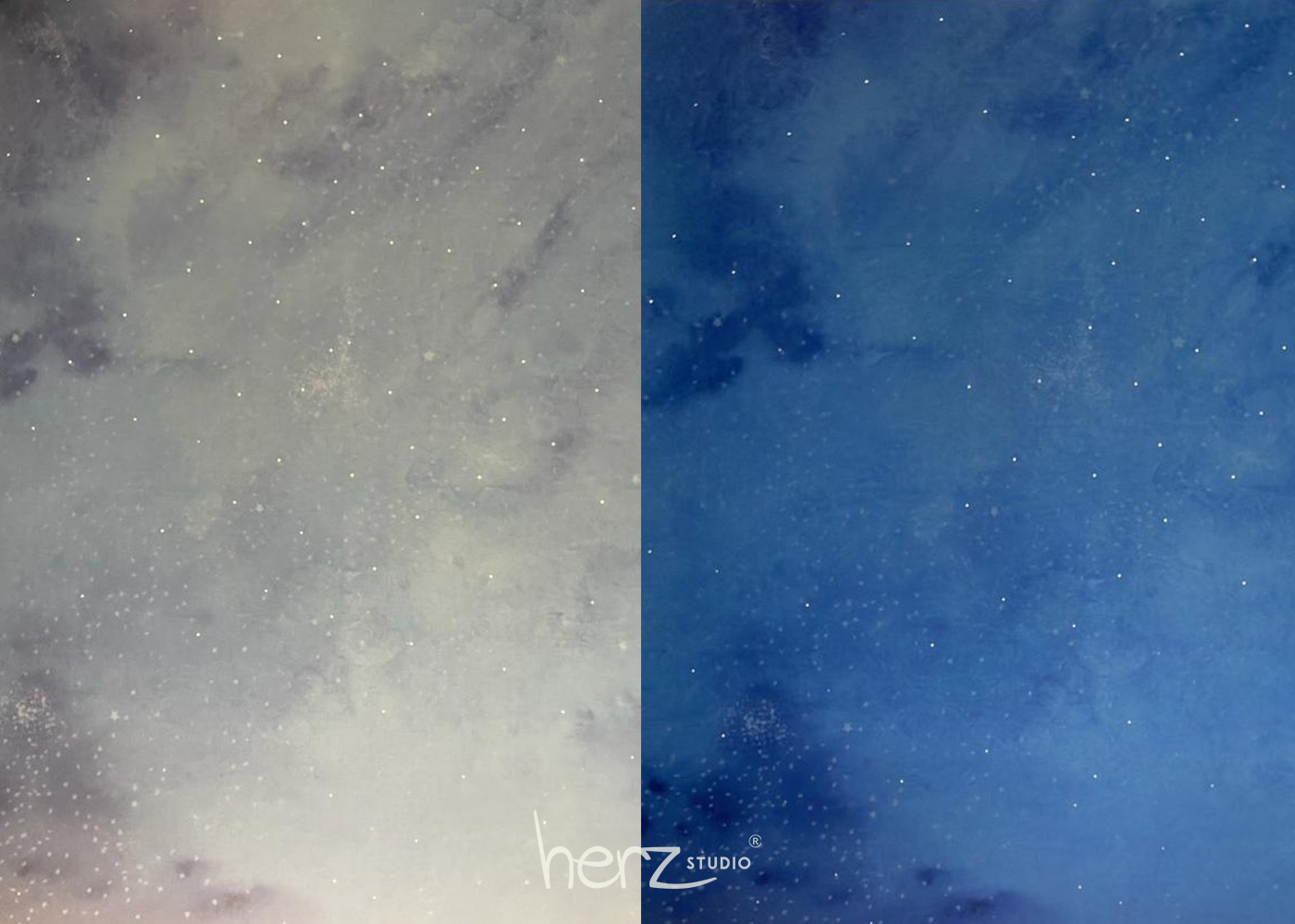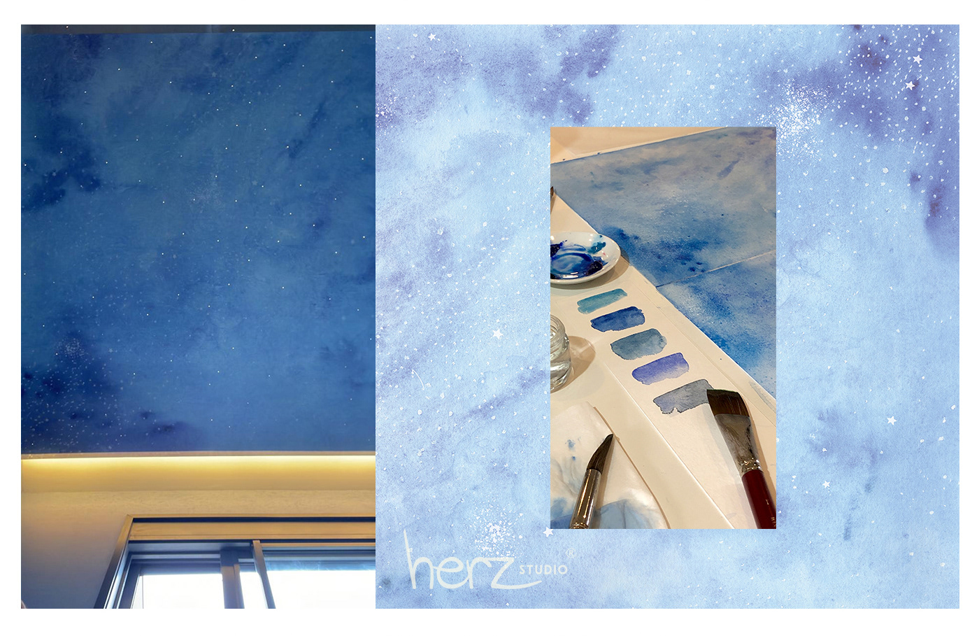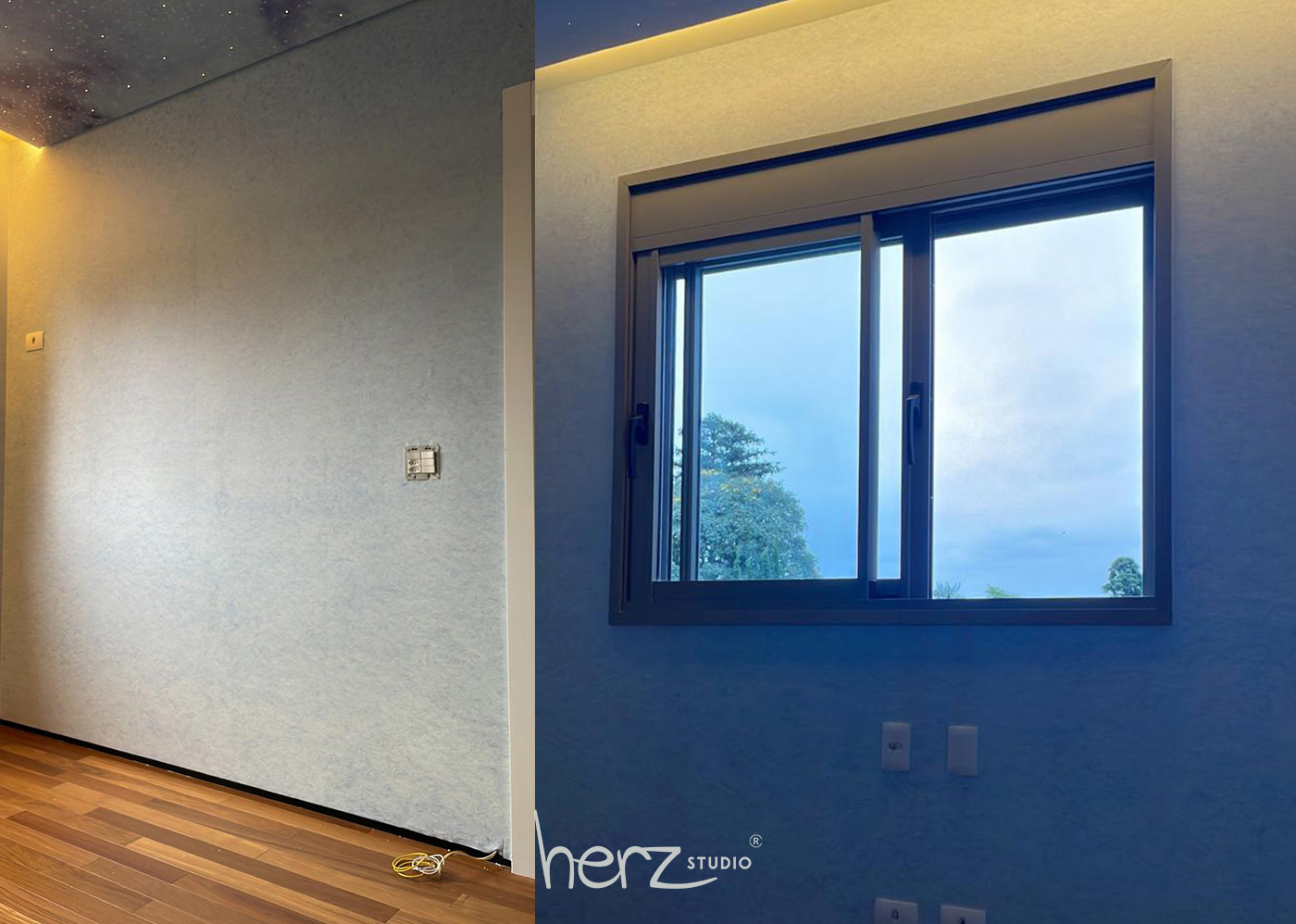 Teto com aplicação de papel de parede e pontos de led. Imagem real.