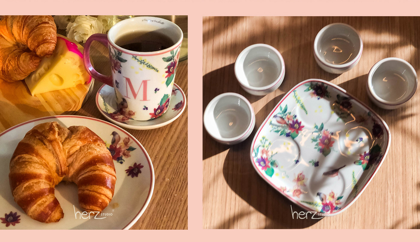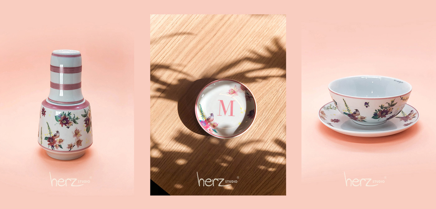 Estampa exclusiva criada em aquarela para aplicação em produtos de papelaria e porcelanas.