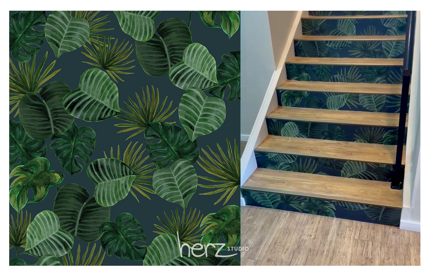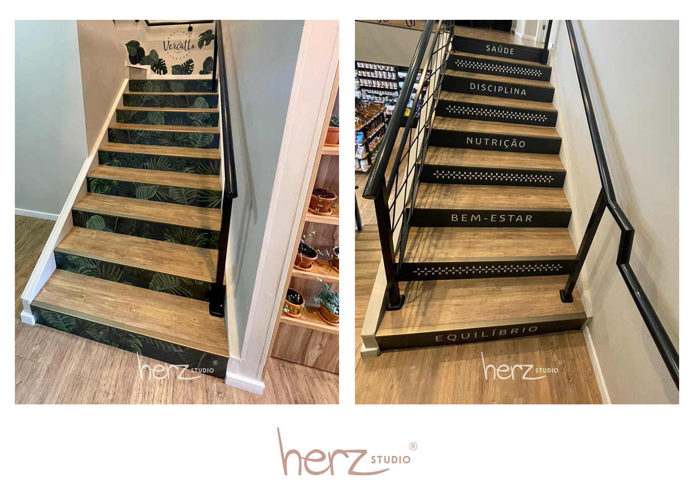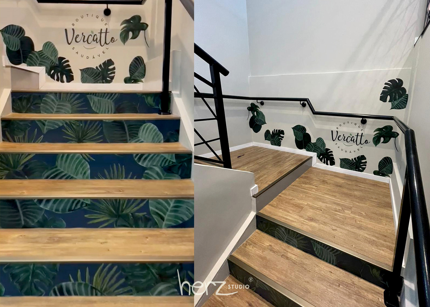 Estampa desenvolvida em tinta acrílica, de acordo com estilo e cores brifados com arquiteta, para Vercatto Boutique Saudável, em Curitiba - PR. Aplicações em recorte e no perfil da escada. Plotagem em adesivo com laminação fosca.